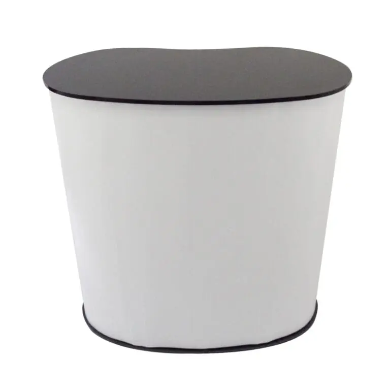 Mesa promocional con entrepaño, base y tablero de plástico y cenefa de PVC.