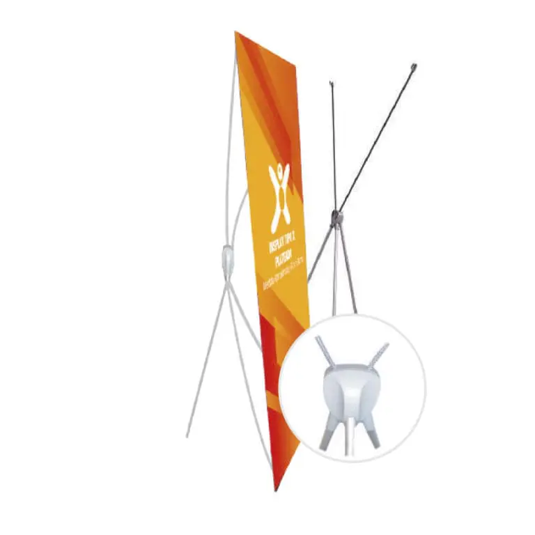 Display banner tipo X color plateado con varillas reforzadas.